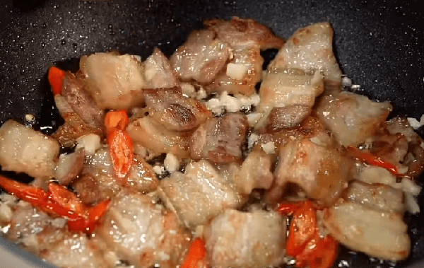4.熱鍋冷油,放入五花肉炒至金黃色。