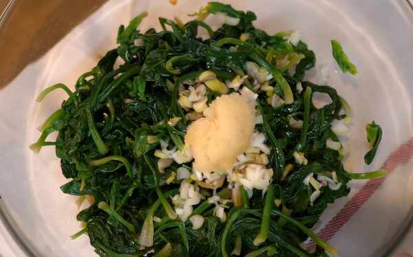 2、準備一個大碗,放入菠菜抓撒。再放入一大勺蒜泥、少量蔥碎,一勺芝麻油、一勺芝麻、兩勺醬油抓拌均勻就做好瞭。