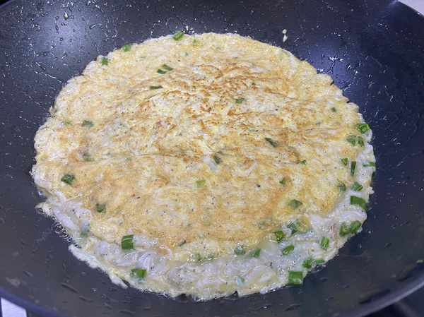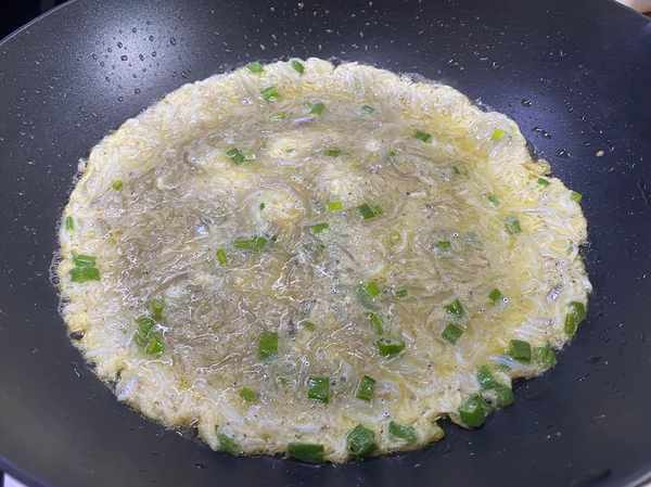步驟3:起鍋燒油,倒入丁香魚雞蛋液,中小火加熱凝固。