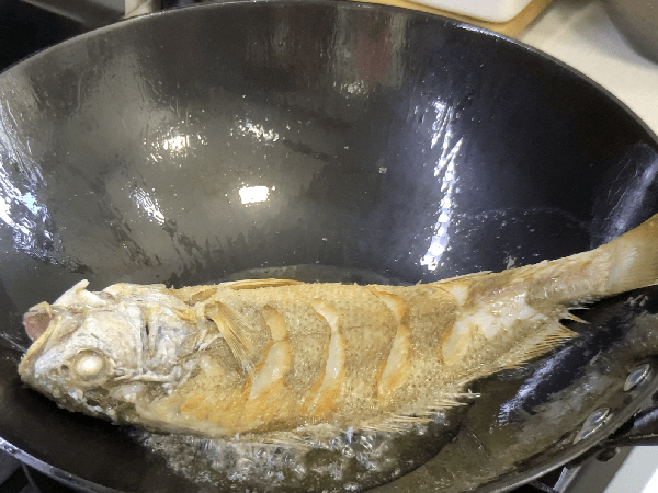 步驟2:起鍋燒油,放入黃姑魚,煎至兩面金黃備用。