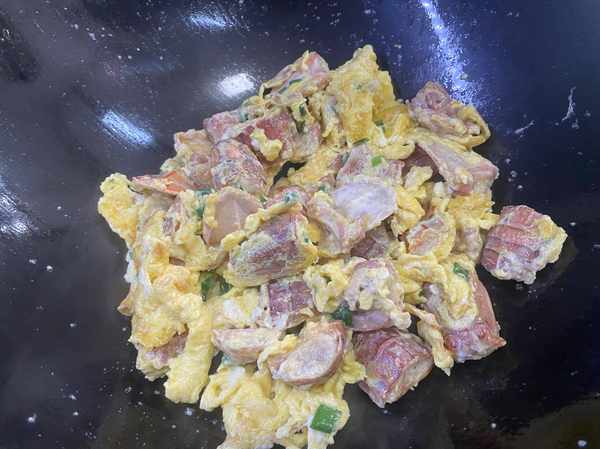 步驟4:起鍋燒油,倒入皮皮蝦雞蛋液,中小火加熱凝固,翻炒均勻就可以出鍋瞭。