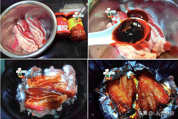 2、五花肉洗凈瀝幹水,加入一大勺叉燒醬、一大勺蜜汁烤肉醬、一勺蠔油、一勺生抽。均勻地塗抹上料汁,放入冰箱醃制過夜待用。