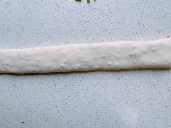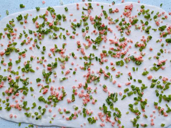 9、面團搟好之後在表面撒上少許食鹽,再把準備好的蔥花和火腿腸丁撒上去,鋪均勻,再撒上少許食鹽,撒好之後,將面皮從小往上卷,卷成長條形。