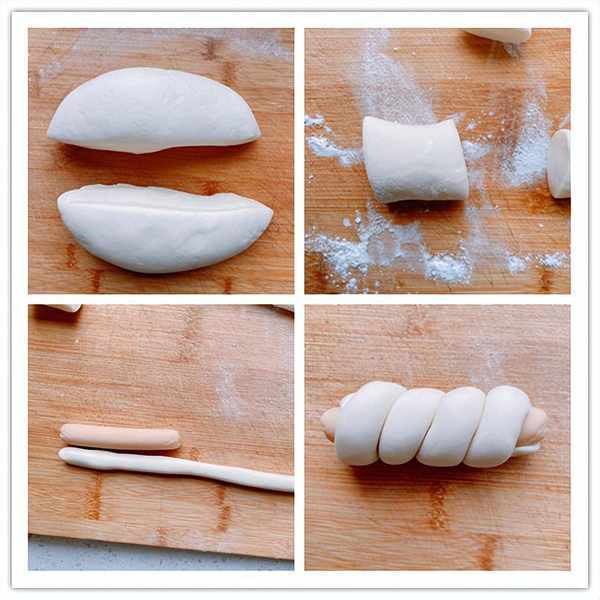 7、取一半先做“蟲”火腿腸饅頭,將面團搓成長條,切成大小均勻的面劑子,大約50g每個,取一個劑子,將它搓成細細的長條,長度是火腿腸長度的4倍左右,取一根火腿腸,把準備好的長條面粉纏在火腿腸上,纏的時候不要太用力,以免面團被壓扁,收口放在底部,火腿腸饅頭就做好瞭。