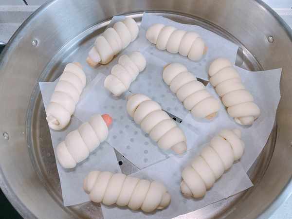 11、將做好的2種火腿腸饅頭蓋上紗佈,放在一邊餳發15分鐘,等體積明顯變大,就可以上鍋蒸瞭。