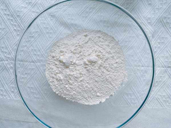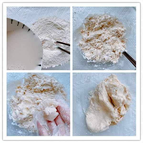 3、攪拌均勻的酵母水加到面粉中,邊倒邊攪拌,攪拌成棉絮狀,加入15g豬油,把它揉成面團,剛開始揉不光滑沒有關系,先放在一邊餳面10分鐘;