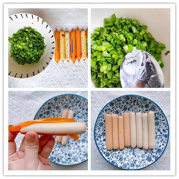 5、餳面的時候來處理餡料,準備適量小朋友的火腿腸以及蔥花,火腿腸去掉外衣,備用。蔥花切好之後加入一點點小蘇打,攪拌均勻,這樣處理過的蔥花不會發黃,蔥花發黃會影響顏值;再將一根火腿腸切成和蔥花差不多大小的火腿腸丁。