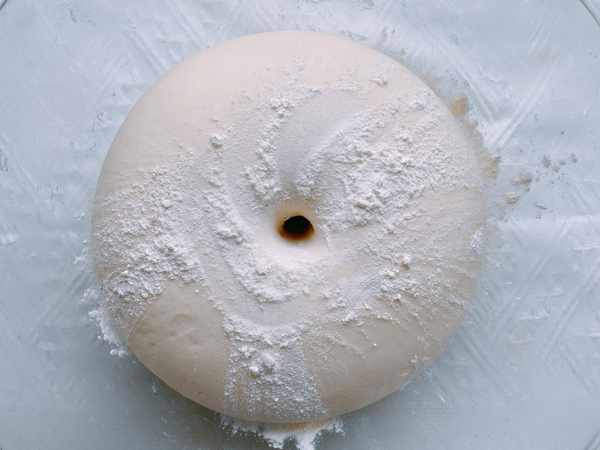 6、餳好的面團在中間戳一個洞,不塌陷不回縮,掰開中間有豐富的蜂窩孔,這樣的面團就是發酵的剛剛好,將面團取出來重新揉搓排氣,揉到沒有餳發之前的大小,將它一分為二。
