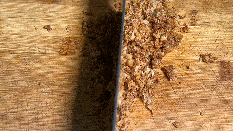5. 將油渣放到案板上,用刀切成小塊