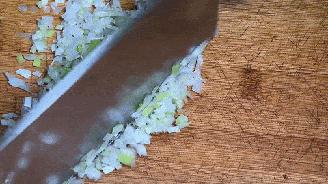 7. 大蔥切成蔥絲,再改刀切成蔥花,再剁一下,放入油渣碎中