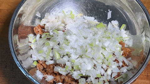 2、 油渣剁碎,大蔥剁成蔥花,加食鹽,味精,胡椒粉拌勻