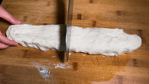 9. 案板上淋上植物油,將醒好的面團放到上面,揉成長條,用到切成4個面劑