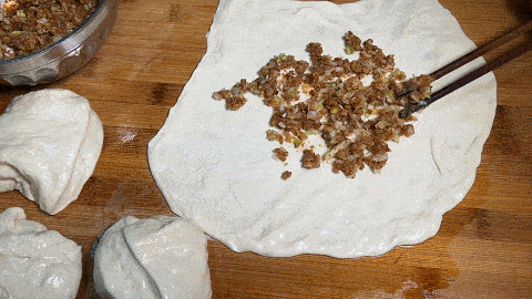 11. 將油渣餡料翻入薄餅上抹勻