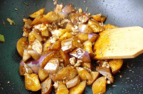 我們也可以將切好的茄子放入鍋中,炒幹。這個時候不要放油,隻要把茄子高溫炸一下,就可以去除茄子的水分,破壞毛孔。幹拌好後,將茄子放入鍋中,用油煎一下,這樣茄子就不會吸那麼多油,也很好吃。