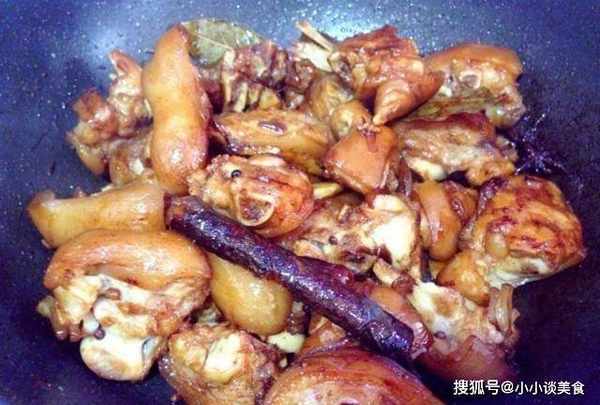 第四步:最後,我們在鍋裡加入炒好的香料,讓trotars更入味!當所有的香料混合均勻後,加入適量的水,用大火將水燒開,蓋上鍋蓋,用文火燉豬蹄一個小時左右。時間過去後,湯幾乎幹瞭。隻需混合即可!