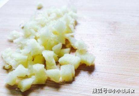 第三步,生薑一片切小方塊,大蒜去皮切小塊,紅辣椒去根去籽切丁,鍋置火上燒熱,加入少許油,冷油下薑末、蒜末、紅辣椒末;