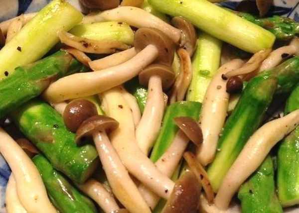 鍋中倒入菜籽油,等油溫升高,將蒜頭放入鍋中,爆香後,先將香噴噴的蟹肉菇放入鍋中,快速翻炒,加少許生抽,即可。把蘆筍放進去調味加少許鹽和雞精就可以出鍋瞭。