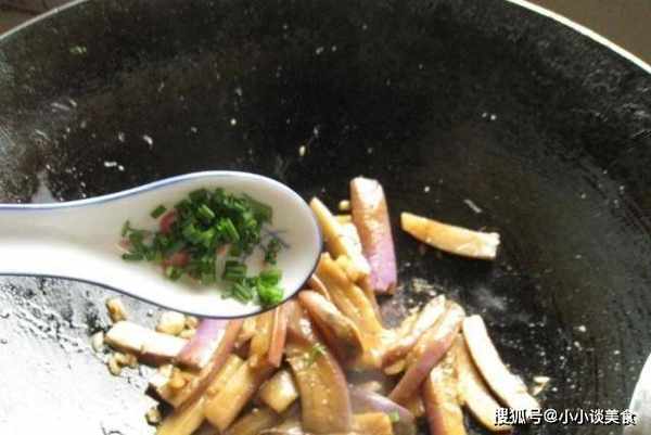 第四步:茄子下鍋後,快炒均勻。攪拌均勻後,倒入少量水,稍煮片刻。炸茄子軟糯入味,一點都不油膩。蔥切段,再加入少量醬油,炒勻即可裝盤,炸茄子就做好瞭!
