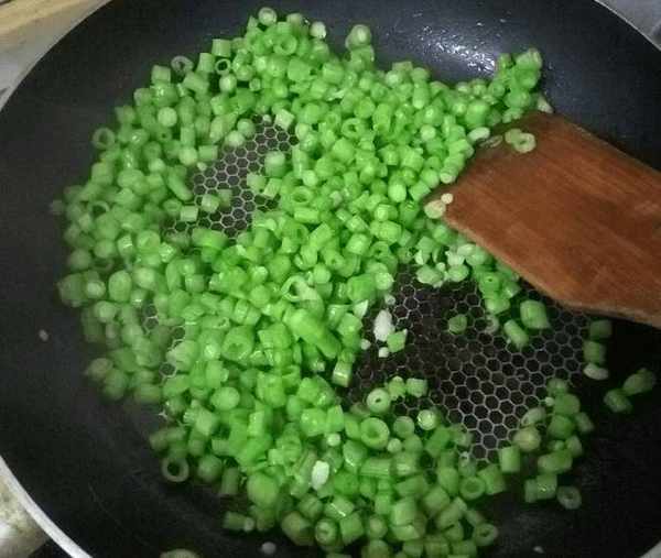 3、隨即在熱鍋中倒入適量食用油,先放入蒜頭爆香,再放入豆角翻炒。
