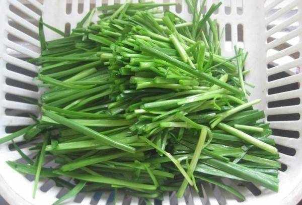 2、將韭菜處理幹凈,用清水浸泡幾分鐘。這將使土壤更容易從它們身上洗掉。韭菜洗凈切塊備用。