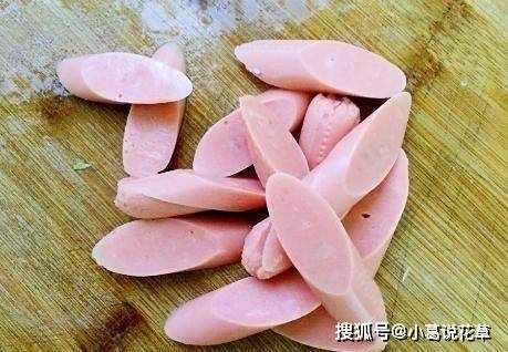 第三步,洋蔥取洗凈,控水切成蔥花,鍋中加入食用油,燒熱,放入蔥花,炒出香味。然後將火腿腸放入鍋中,繼續炒至火腿腸變軟;