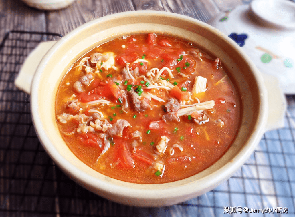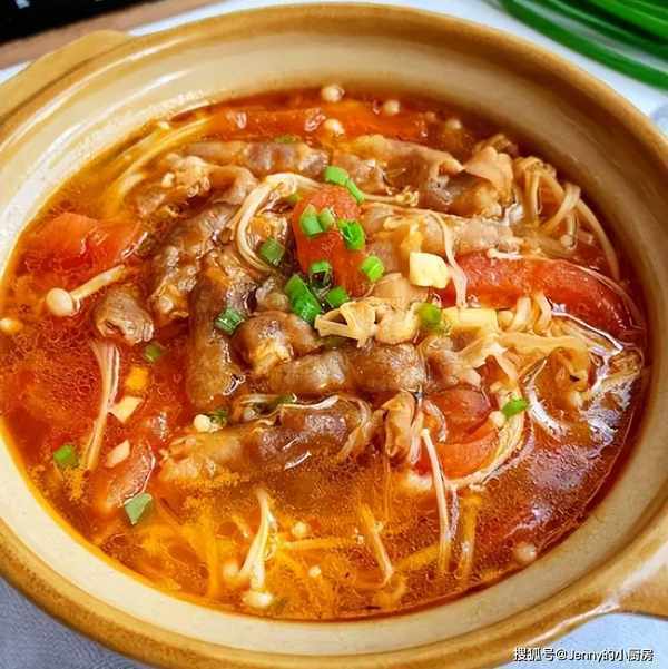 番茄去皮,切成小塊;金針菇去掉根部洗凈。鍋內加水,煮開後倒入肥牛卷,煮到變色撈出。