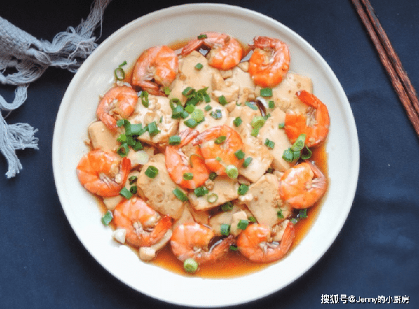 接著放入豆腐,略微煎一下,再倒入蝦仁翻炒。