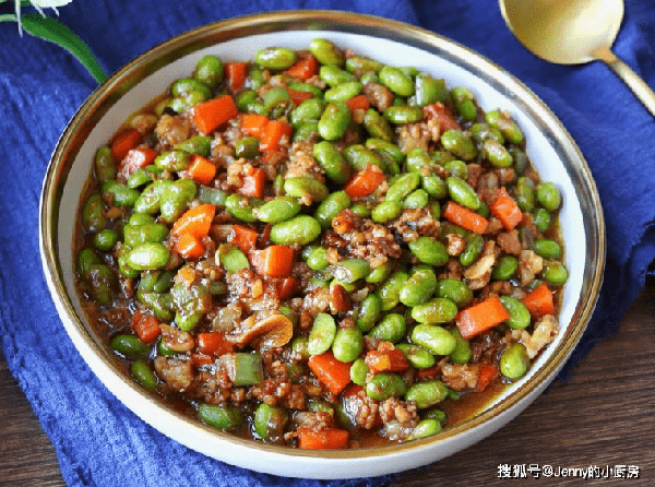 然後加入少許鹽、白糖、生抽、蠔油、老抽翻炒均勻,再倒入毛豆翻炒幾下,加入清水,燜煮三分鐘。