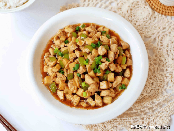 最後倒入雞丁翻炒均勻,再加入生抽、淀粉水翻炒,炒到濃稠即可。