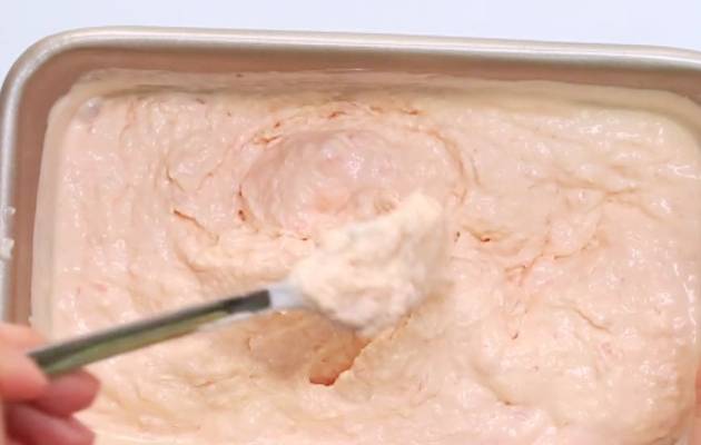 第四步:隨後準備一個略帶高度的模具,把冰淇淋液倒入其中,然後放入冰箱冷凍櫃,每隔一個半小時取出,用勺子不停攪拌,直至還原放入冰箱前的狀態,而後再次放入冰箱冷凍;一般來回進行三次,冰淇淋就能凝固成略帶硬度的可食用狀態瞭。