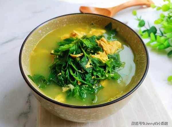 最後放入枸杞葉攪拌均勻,再次煮開後,加鹽調味,這道湯就做好瞭,鮮美好喝,回味無窮。
