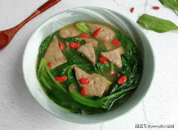 另起鍋加水,大火煮開,倒入豬肝、菠菜、枸杞,煮一分鐘。