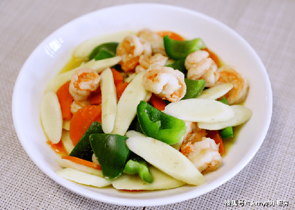 最後倒入胡蘿卜、山藥、青椒翻炒,炒到山藥斷生,再加入鹽、雞精翻炒均勻,這道菜就做好瞭。