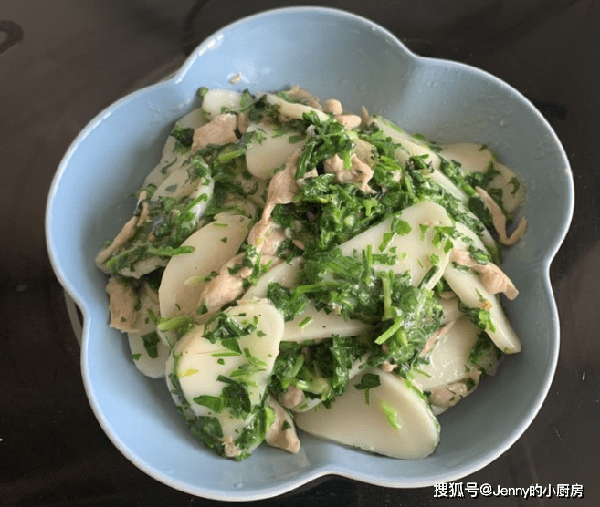 最後倒入肉絲、薺菜翻炒均勻,再加入少許鹽、雞精,快炒幾下,這道菜就做好瞭。