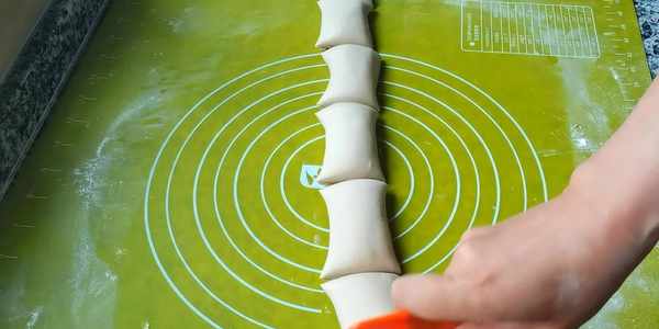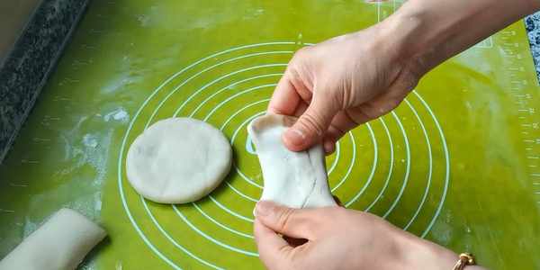 9,取出面團,兩頭捏實,防止油酥漏出,再把兩頭向中間對折。