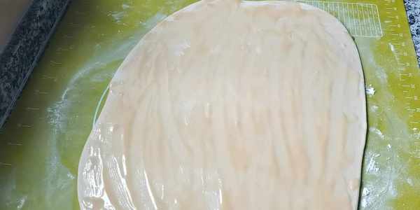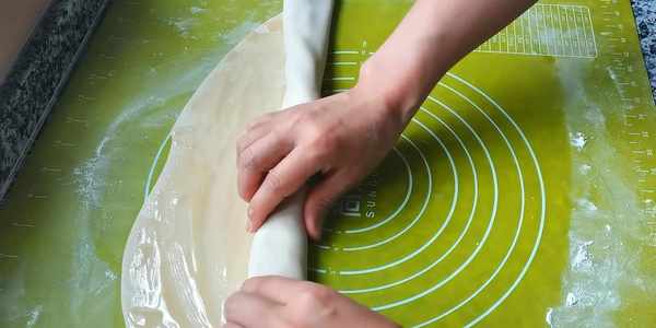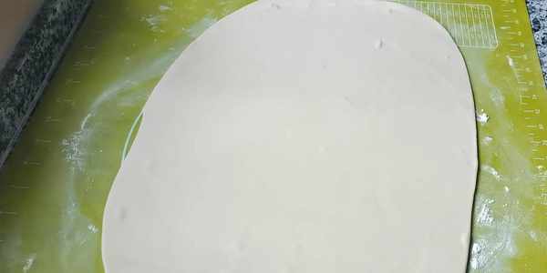 5,醒好的面團揉搓均勻,搟成長方形的大薄餅。