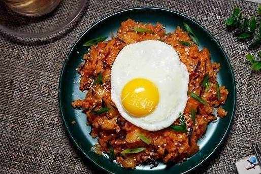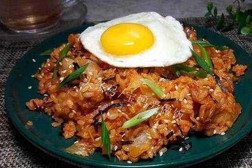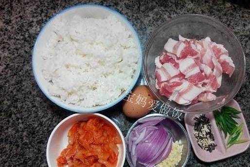 所需食材:隔夜飯,五花肉,辣白菜,洋蔥,大蒜,蔥段,雞蛋,芝麻海苔碎;