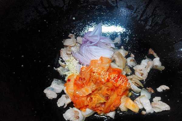 *五花肉切薄片,泡菜切小片(小塊),洋蔥切絲,大蒜切末,蔥切蔥段或蔥花均可。