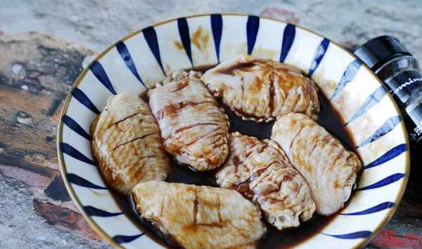 先將雞中翅正反面劃痕,用料酒、鮮汁醬油、蠔油冰鎮醃制半小時。
