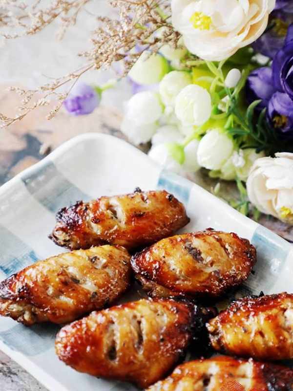 12分鐘之後,抽出烤鍋,將雞翅翻個面,再刷上一層蜂蜜,略撒羅勒葉,繼續烤12分鐘,即可出鍋裝盤啦!