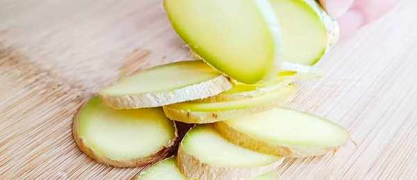 3.用廚房餐巾紙把生薑表面的水分擦幹,然後再將其切成薄片。全部切好之後放入盤中備用。