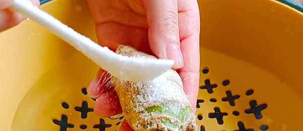 2.清洗幹凈之後再放入涼水中,再次清洗一遍。準備一塊新鮮的生薑,同樣放在清水中清洗一遍。這裡的生薑表皮不要去除哦。所以我們需要用精鹽水仔細地清洗,這樣在吃的時候就不容易吃到灰塵或者是泥土啦!