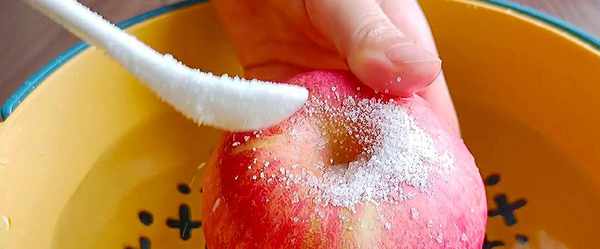 1.首先準備一個新鮮的蘋果,將其放在冷水中,給它清洗一遍。然後再往蘋果裡面加入一勺精鹽,用手給它搓洗一遍。市面上有很多蘋果都打蠟瞭,這時候我們用粗糙的食鹽給它清洗一遍,這樣蘋果就能放心食用瞭。