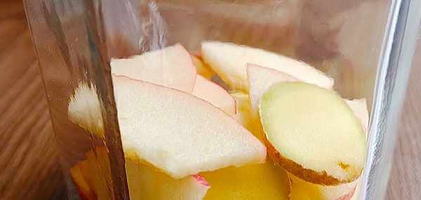 5.準備一個無油無水的玻璃瓶,將準備好的蘋果片放在裡面。然後再放入一層老薑片。再放入一層蘋果片,一層一層地將其放滿就可以啦。