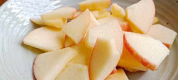 4.處理好的蘋果我們將其對半切開,然後將其切成小塊放入碗中備用。去掉蘋果核切成薄片放入碗中備用。