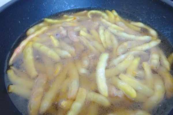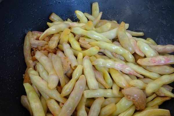 6、炒幾下,遇熱的豆角就會變色成金黃的樣子,再炒一會兒,就沒有紅色瞭都會變黃色,有點神奇是不是!