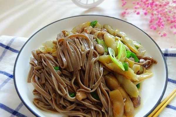 材料:豆角500克,蕎麥掛面200克,豬肉200克,蔥花,醬油和鹽適量。