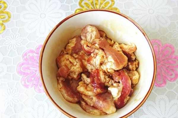 2、燉豆角還是放點肉比較好吃,減肥季,不用多放,選擇一塊五花肉,切片後用生抽和一勺淀粉拌勻醃制10分鐘。