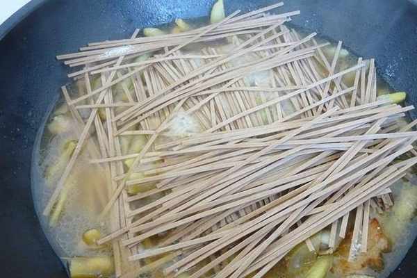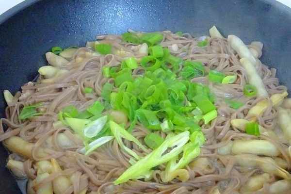 8、大約15分鐘後,放入蕎麥掛面,用筷子撥開。不要堆積著放,受熱發軟後,再輕輕按壓一下,入湯汁裡,煮開後,中火燜。
