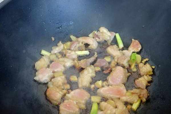 4、然後放入肉片翻炒至變色。經過生抽和淀粉醃制的肉片,怎麼燉口感都不會硬,很軟嫩。